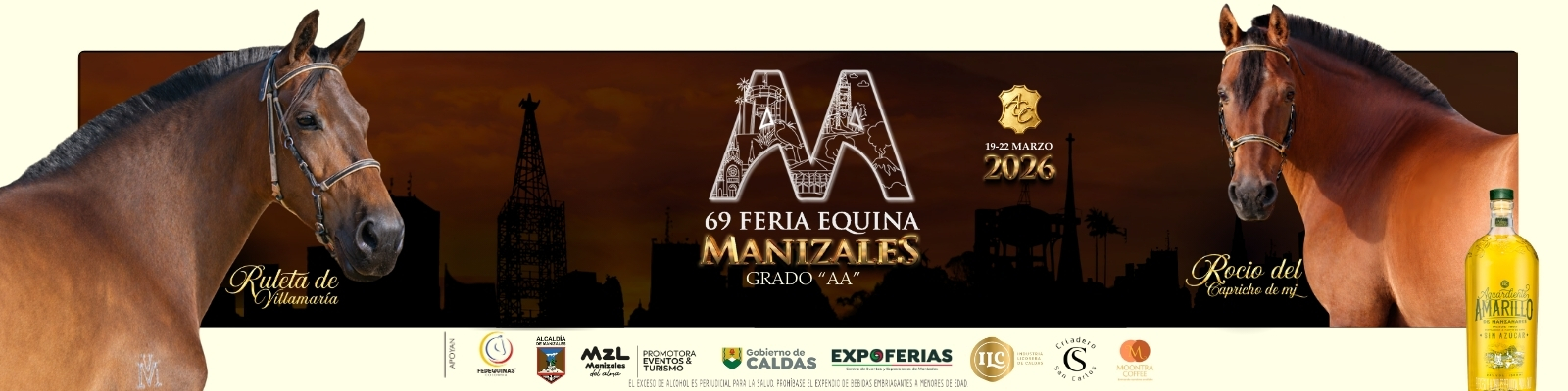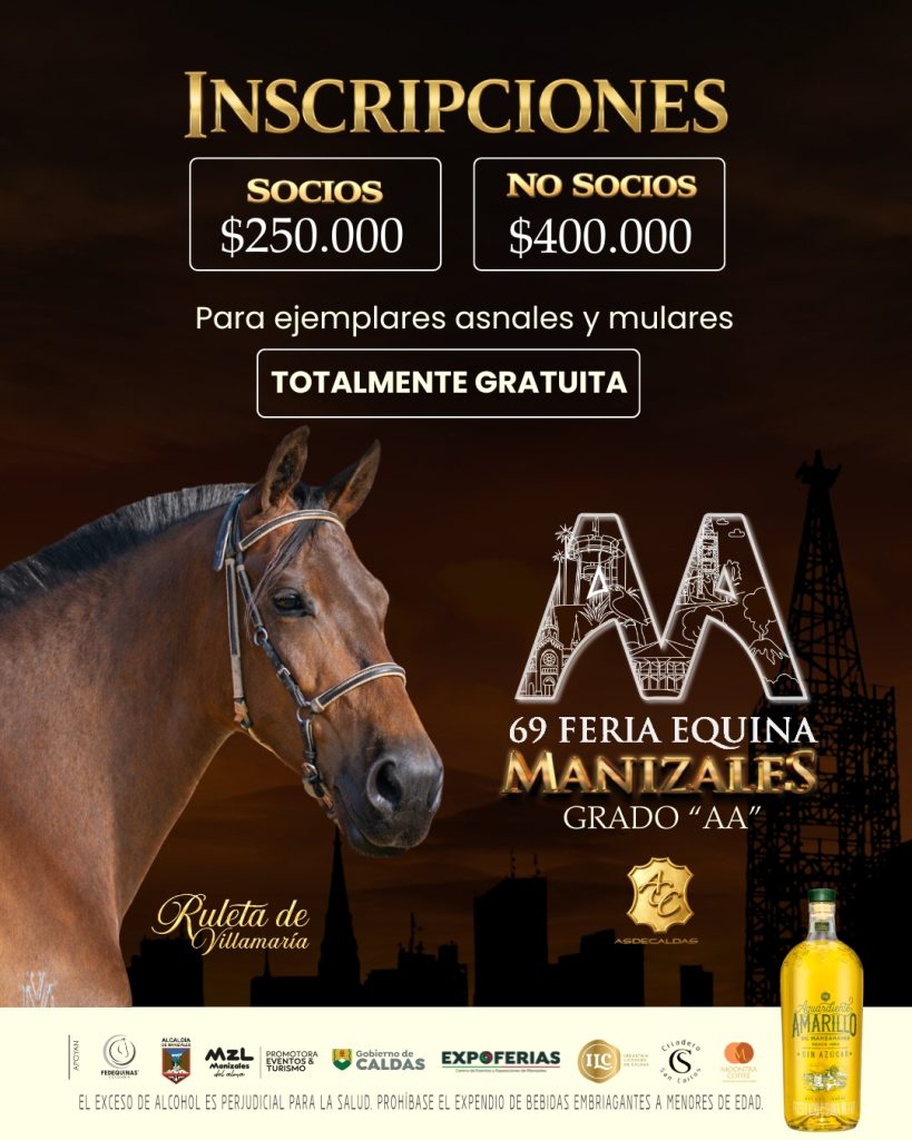 a Feria Equina de Manizales, en su versión número 69, se realizará del 19 al 22 de marzo de 2026 en EXPOFERIAS, bajo la organización de ASDECALDAS. Este importante evento contará con una destacada Feria Equina Grado “AA” , además de amplios espacios de consumo, comercio y experiencias para toda la familia, consolidándose como un punto de encuentro para los amantes del mundo equino y el público en general. ¡Una cita imperdible con la tradición y la pasión equina!